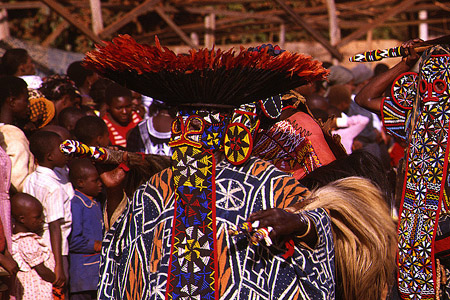 ... pendant le défilé des masques parmi la foule, masques de perles de verre tissé, chasse-mouches, coiffures de plumes...